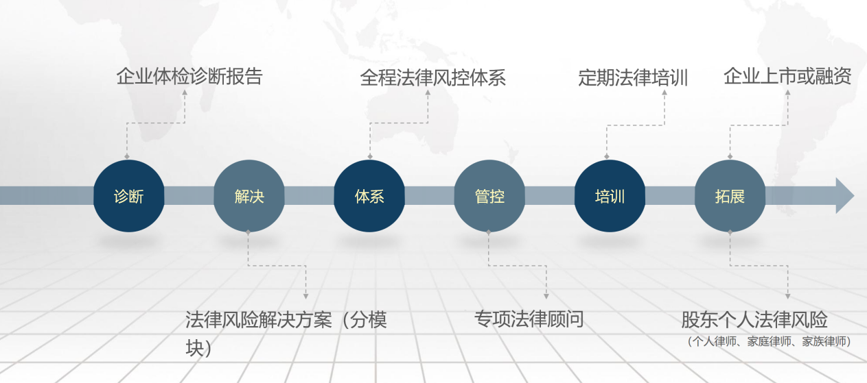 双方沟通协商——确定风险体检范围——签署风险体检服务协议——编制风险体检方案——企业填写风险体检调查问卷——根据需要进行走访调查——汇集信息,分析评价——编制初步法律风险调查分析报告——内部评审——提交正式报告